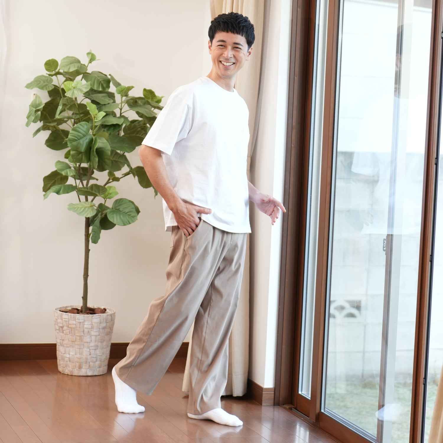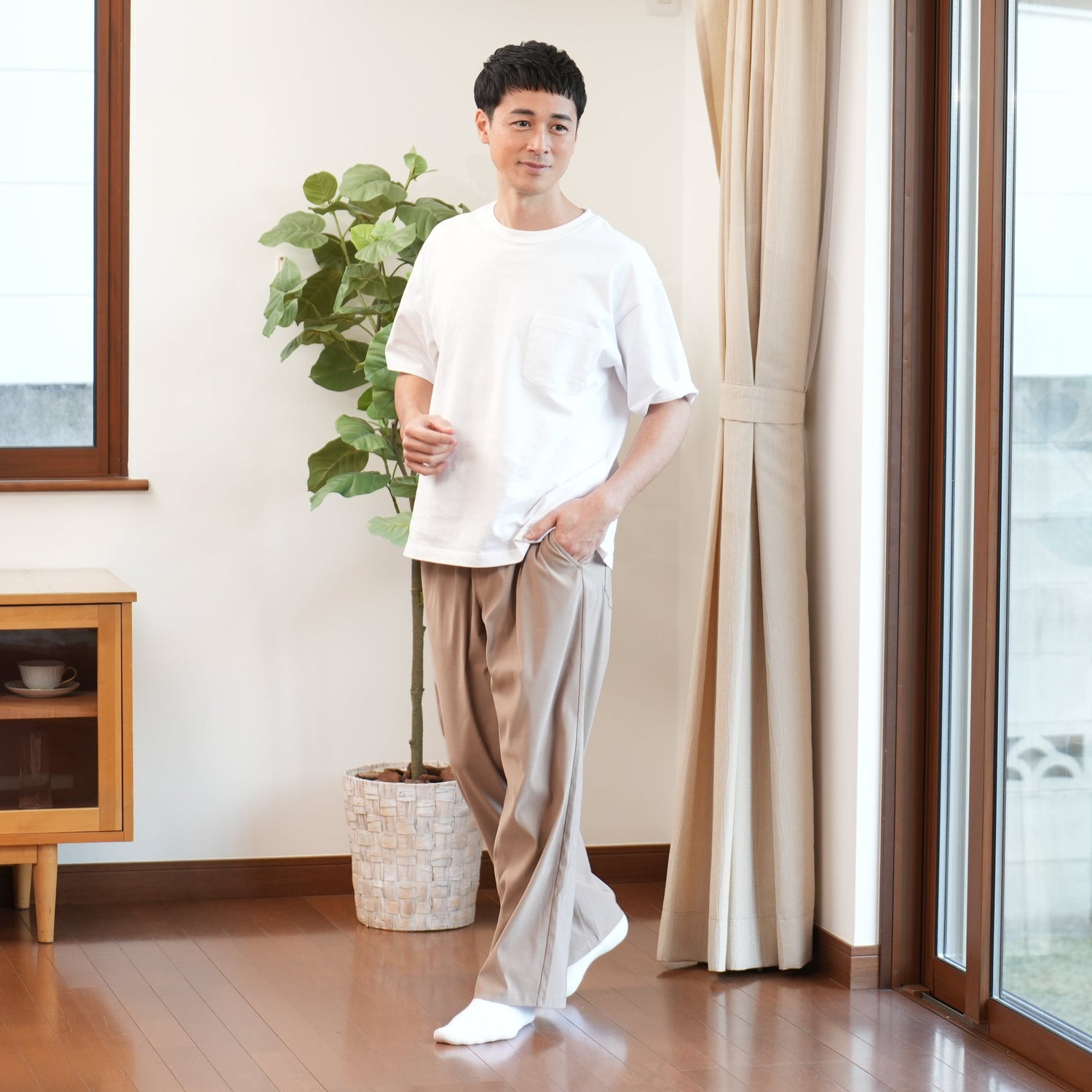 ストレッチ素材とゆとりあるシルエットで、