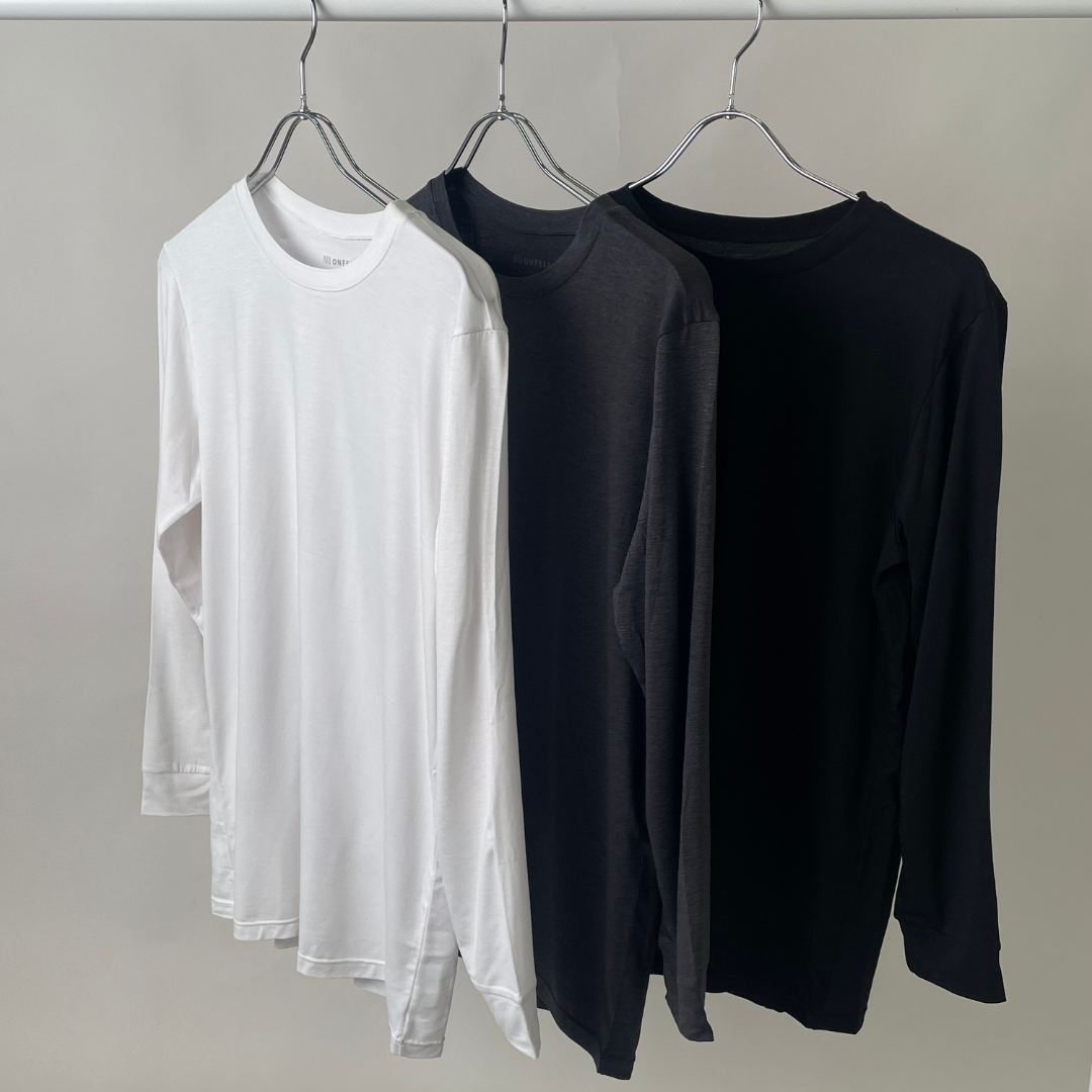 シーンを選ばないクルーネックデザイン。ニットやスウェットのインナーにおすすめのアイテム。袖リブで冷気の侵入を防ぎます。